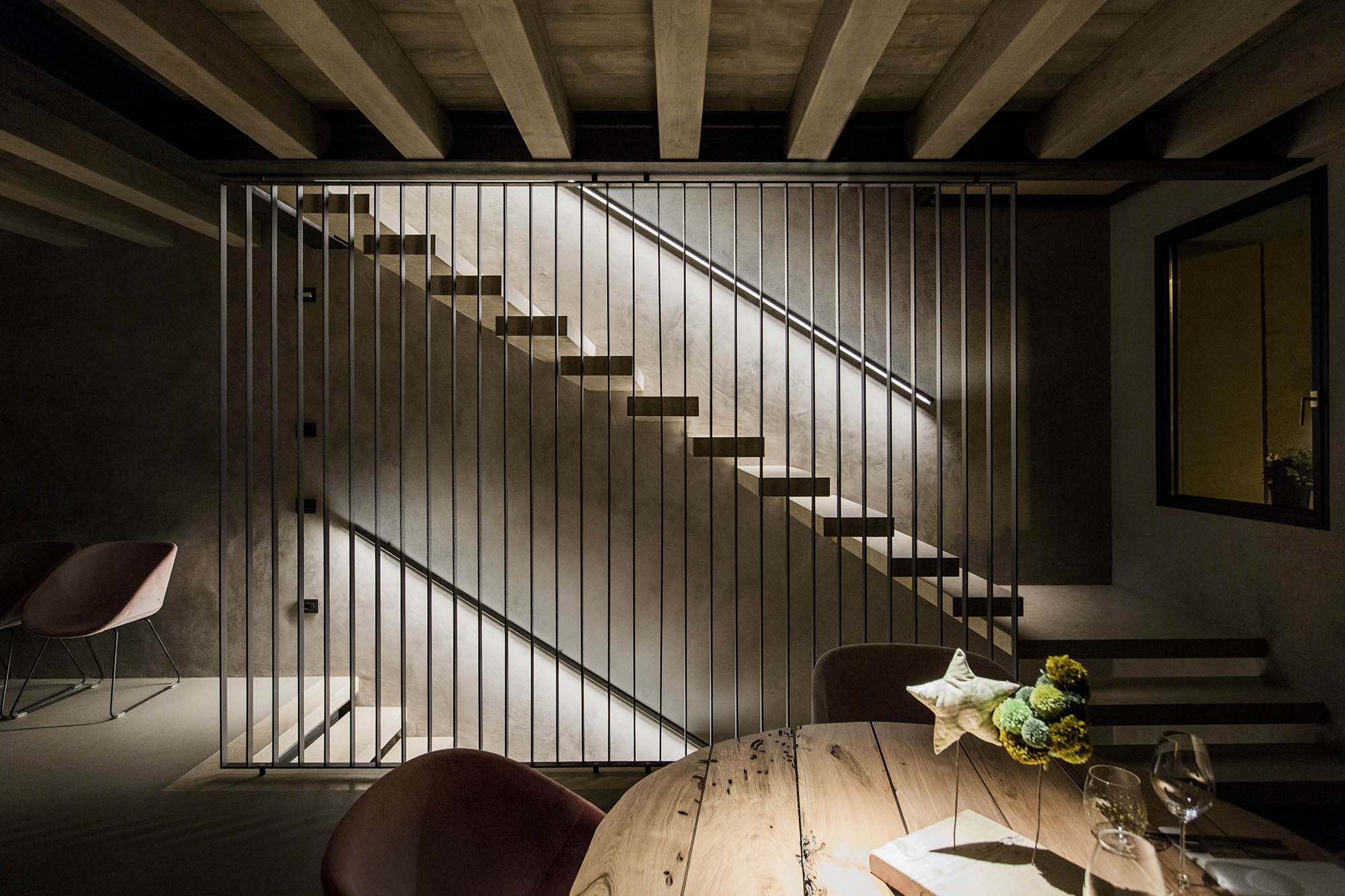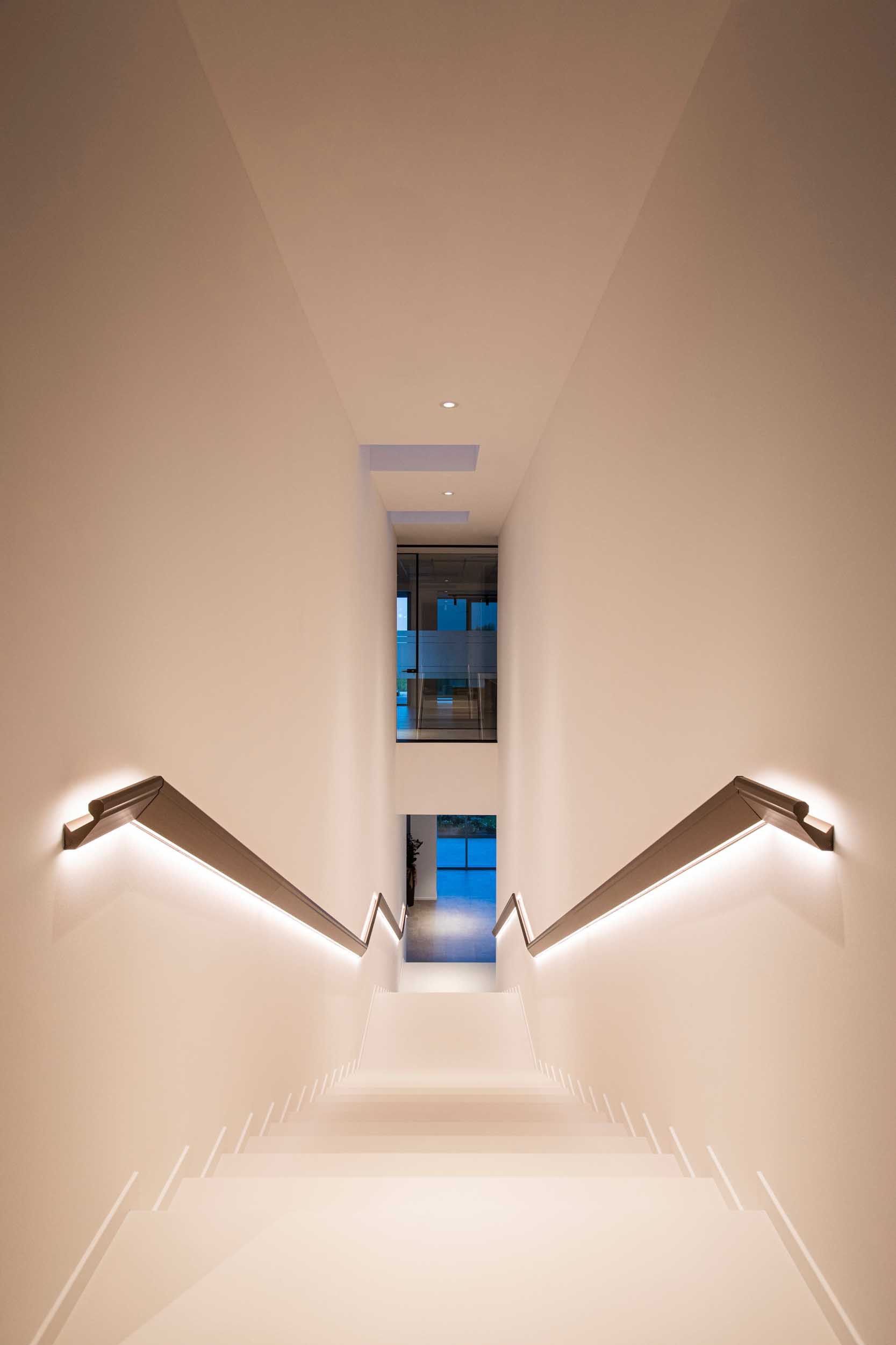 La sorgente luminosa posta nella parte interna proietta la luce verso la parete, in modo da illuminare tutto il vano scale evitando l’abbagliamento.